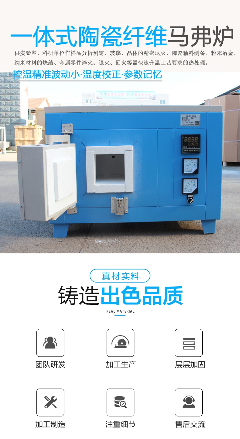 陶瓷馬弗爐改變了普通馬弗爐笨重,電爐絲易損壞,升溫速度慢等缺點,其性能達到進口同類產品水平。
