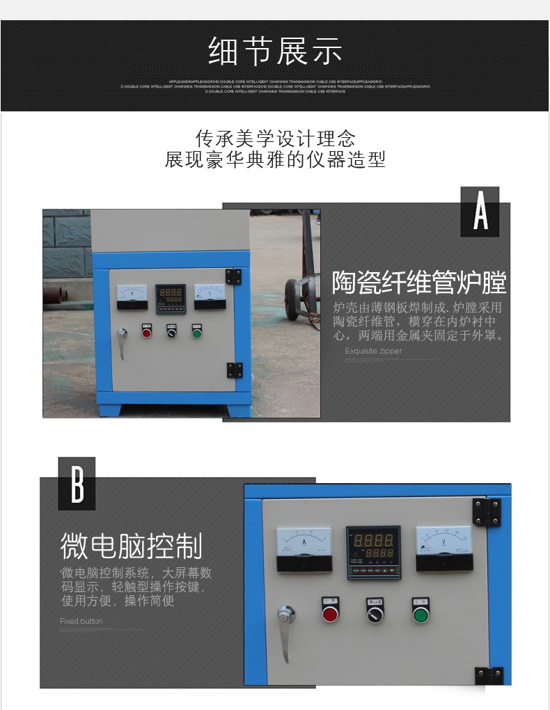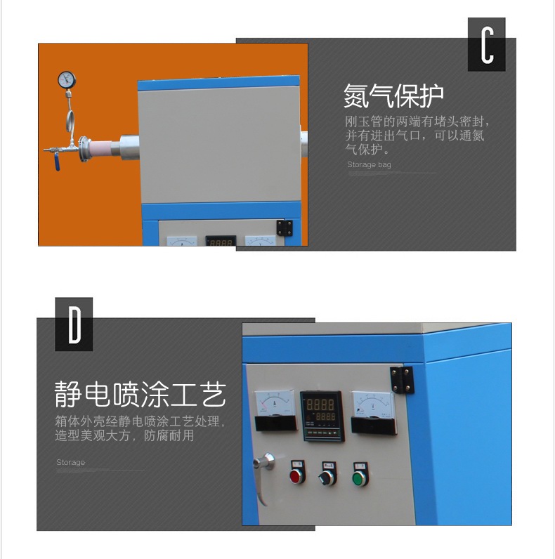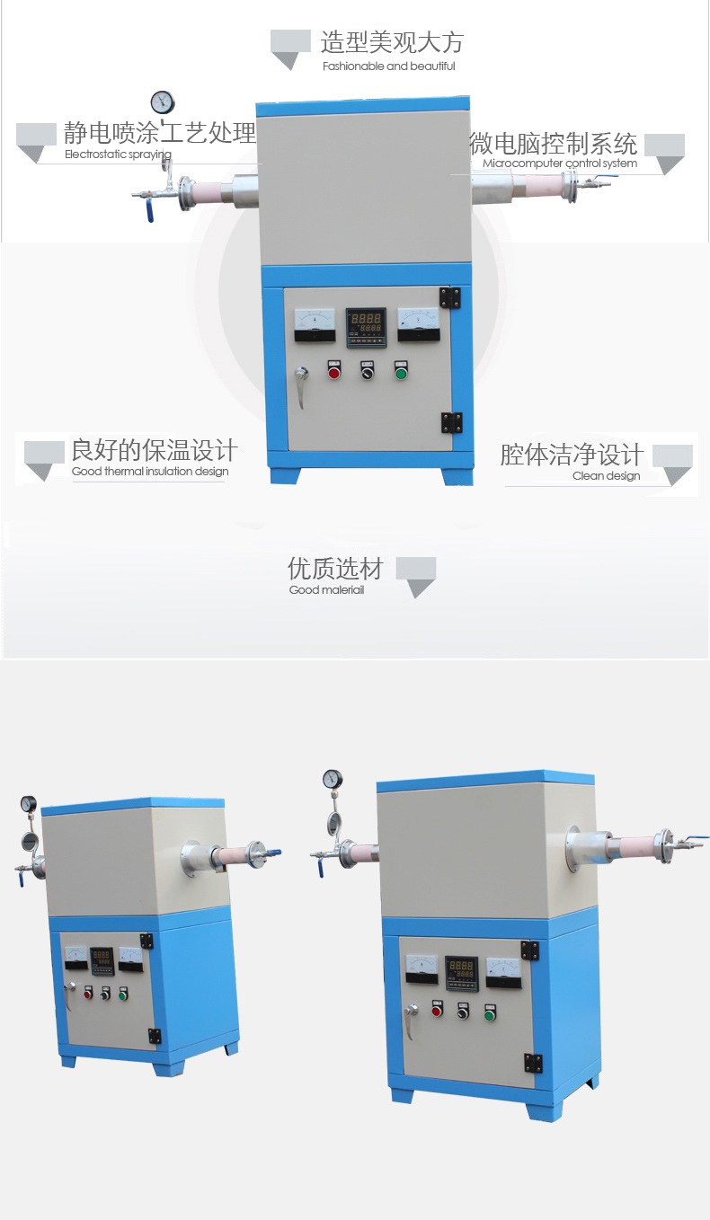 1.外殼采用鋼板這邊焊接而成,外表靜電噴涂,美觀大方。爐膛采用氧化鋁陶瓷纖維材料制成,加熱元件為硅鉬棒。工作室為優(yōu)質(zhì)高密度剛玉管,剛玉管的兩端配有法蘭裝置,可以對(duì)爐膛內(nèi)部抽真空。也可以通入氣氛保護(hù)。